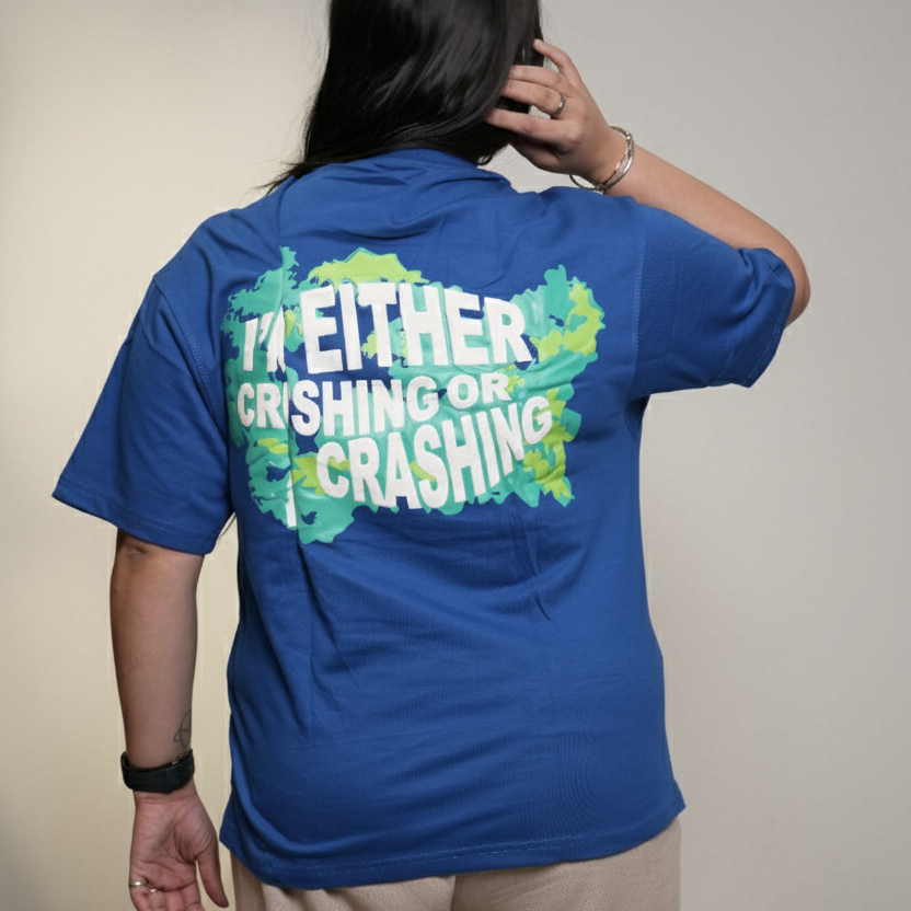 The Crashwave was born from the clash between calm and chaos — that moment where life hits you in waves and you decide to stand stronger each time. The bold green splash on the back represents impact, movement, and the raw energy of taking risks. The statement print, “I’M EITHER CRUSHING OR CRASHING,” captures the mindset of someone who doesn’t live in the middle — you either go all in or not at all.